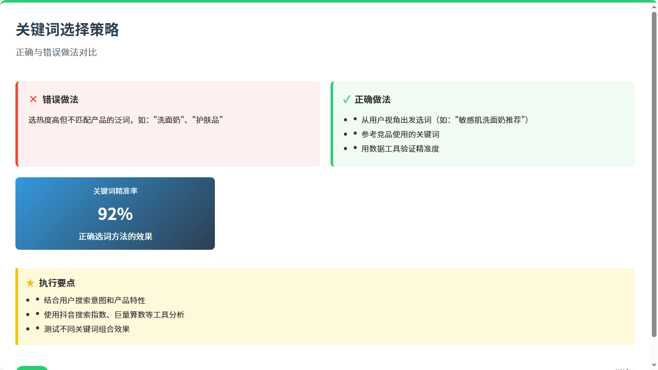 1. 选关键词:用“用户视角”+“竞品参考”+“数据验证”,选“精准词”而不是“热词”;