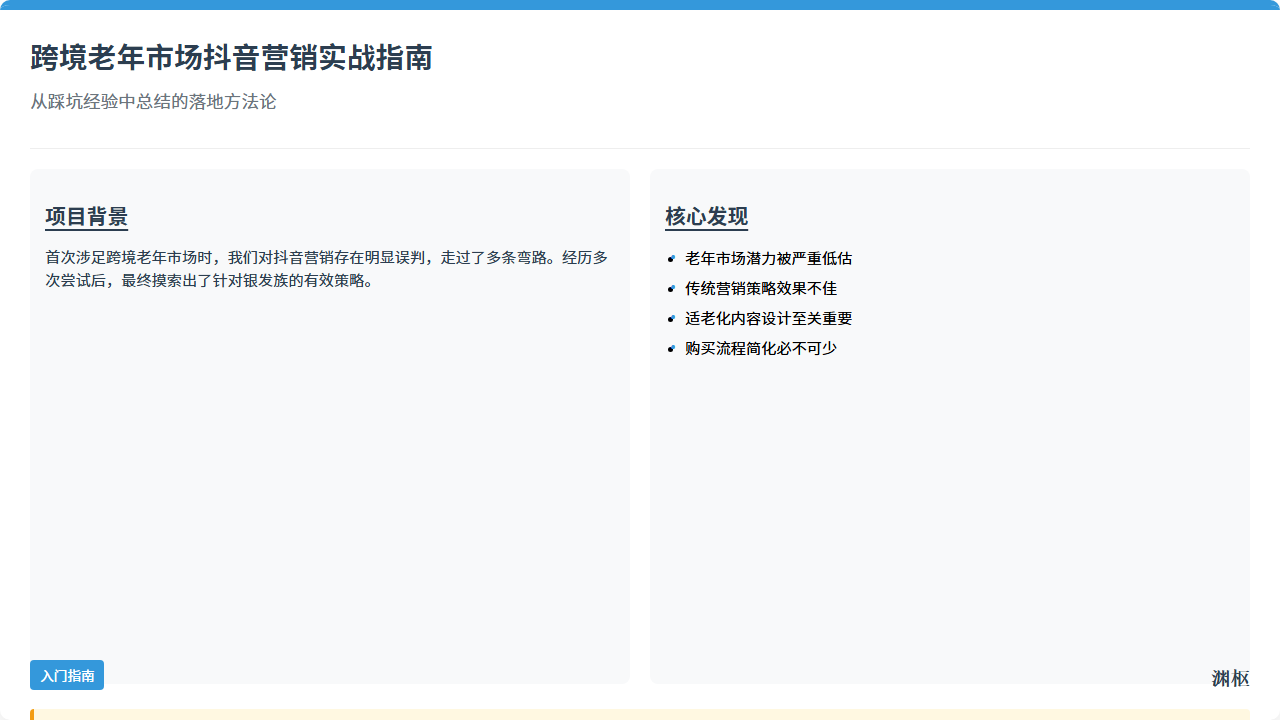 < p >我先跟你说个糗事——去年我第一次做跨境老年市场的抖音营销,差点把自己搞崩溃。现在回头看,全是新手才会踩的“低级坑”,但踩完坑我摸出了一套“能落地的笨办法”,今天我一步一步教你,就像带你一起重新做一遍这个项目。< /p >
