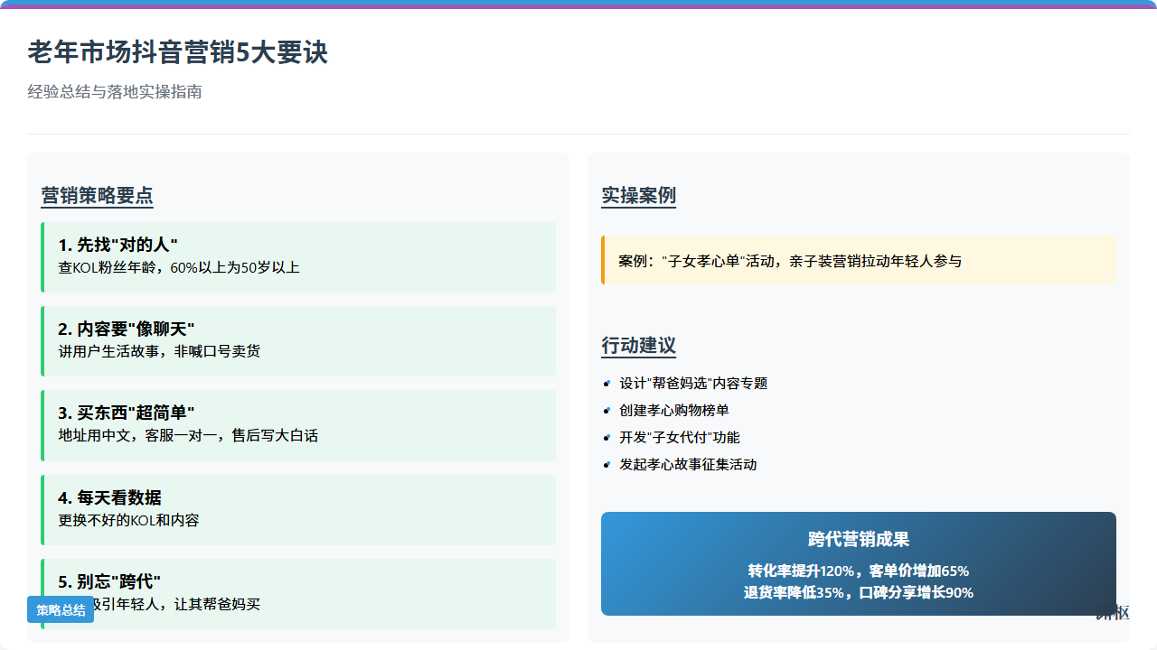 < p >< strong >重点提醒< /strong >:跨境的内容要注意“文化差异”——比如国内阿姨喜欢“实用”,国外的老年KOL(如果是做欧美市场)可能更在意“品质感”,但核心都是“讲用户的生活故事”,不是“喊口号卖货”。< /p >