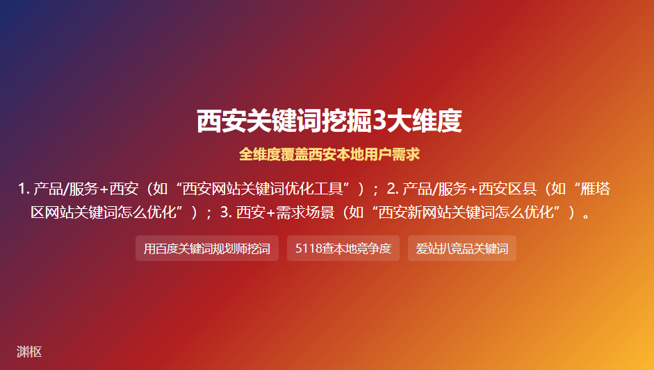- 2. 产品/服务+西安区县:如“雁塔区网站关键词怎么优化”“未央区企业网站关键词怎么优化”,触达区县精准客户;