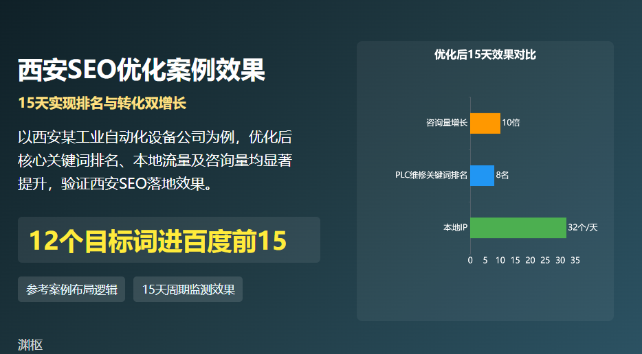- 12个目标词进百度前15名(如“西安PLC维修关键词排名”从28名升8名);
